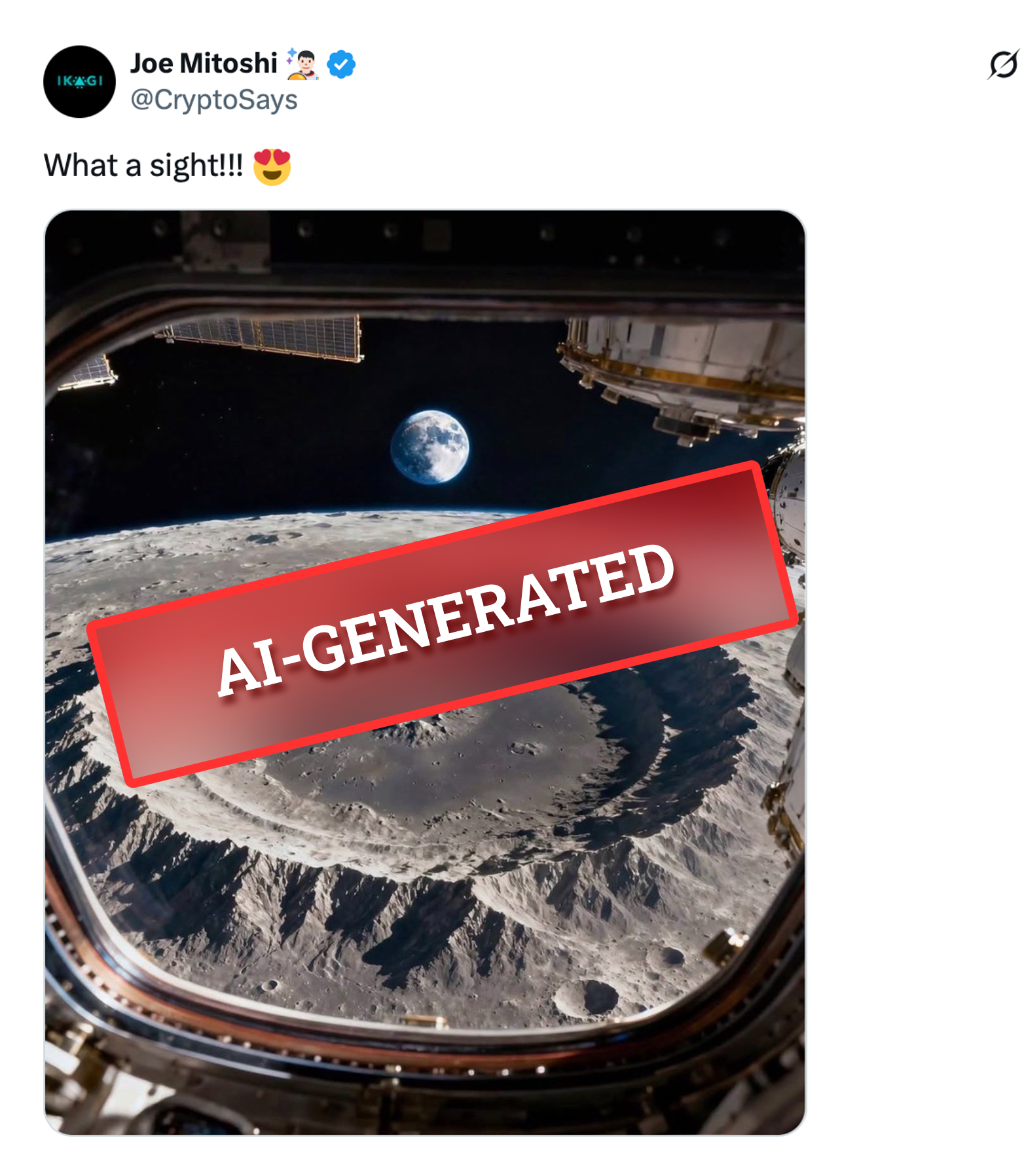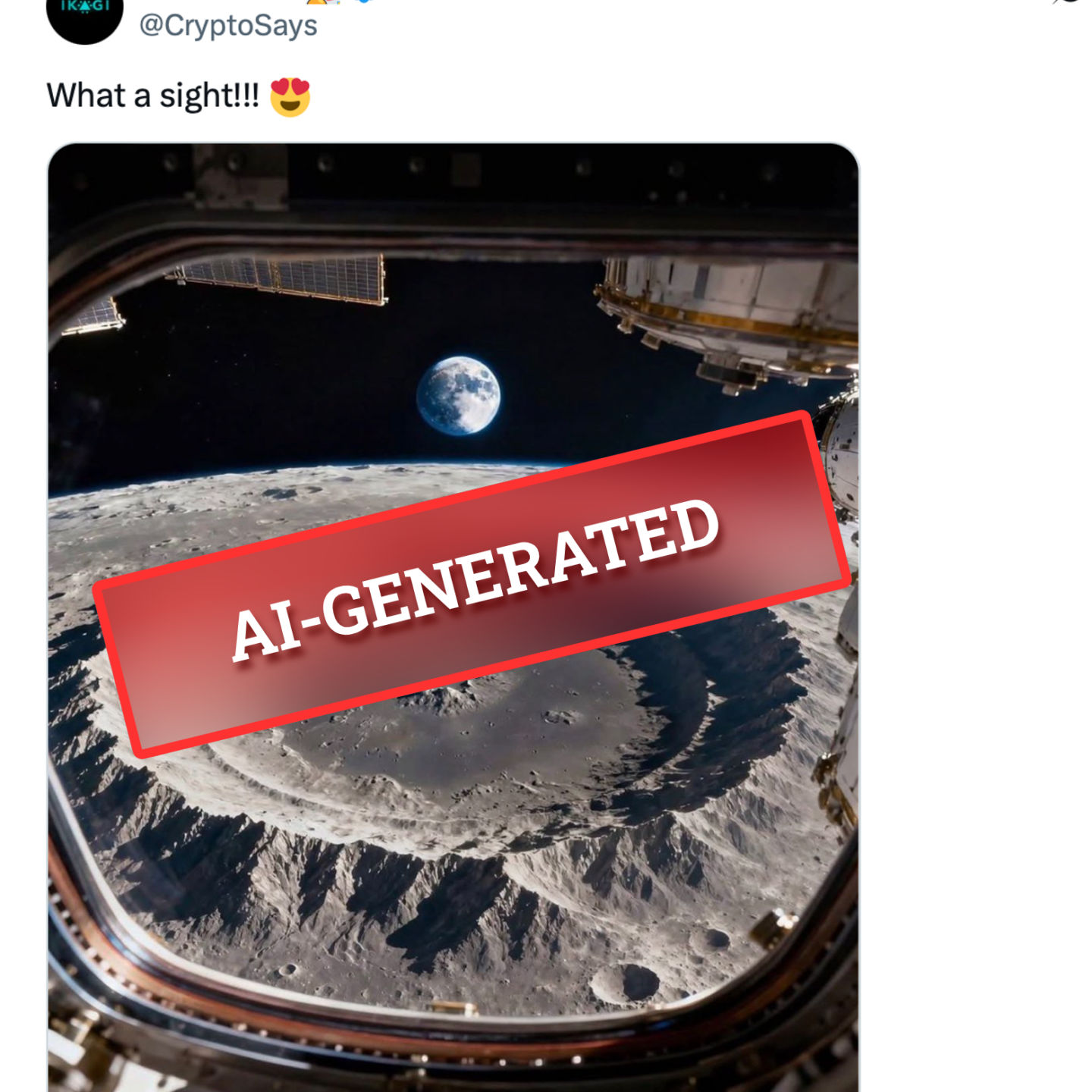 - One day later, onApril 7, 2026, X user @CryptoSays posted another image — a highly realistic-looking space-style photo seemingly taken through a spacecraft window — with the caption: “What a sight!!!” The post has since garnered over 2.7 million views and more than 80,000 likes.