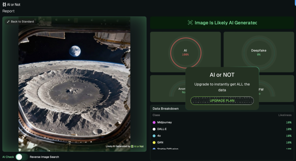 Two widely shared visuals claiming to show NASA’s Artemis II mission are not authentic: the video is a ground-based astrophotography image from 2024, not mission footage, and the image was flagged as 100% likely AI-generated — a conclusion the user themselves confirmed by calling it a “nice render.” As space exploration captures global attention, verifying the primary sources for such spectacularly looking imagery has never been more critical.