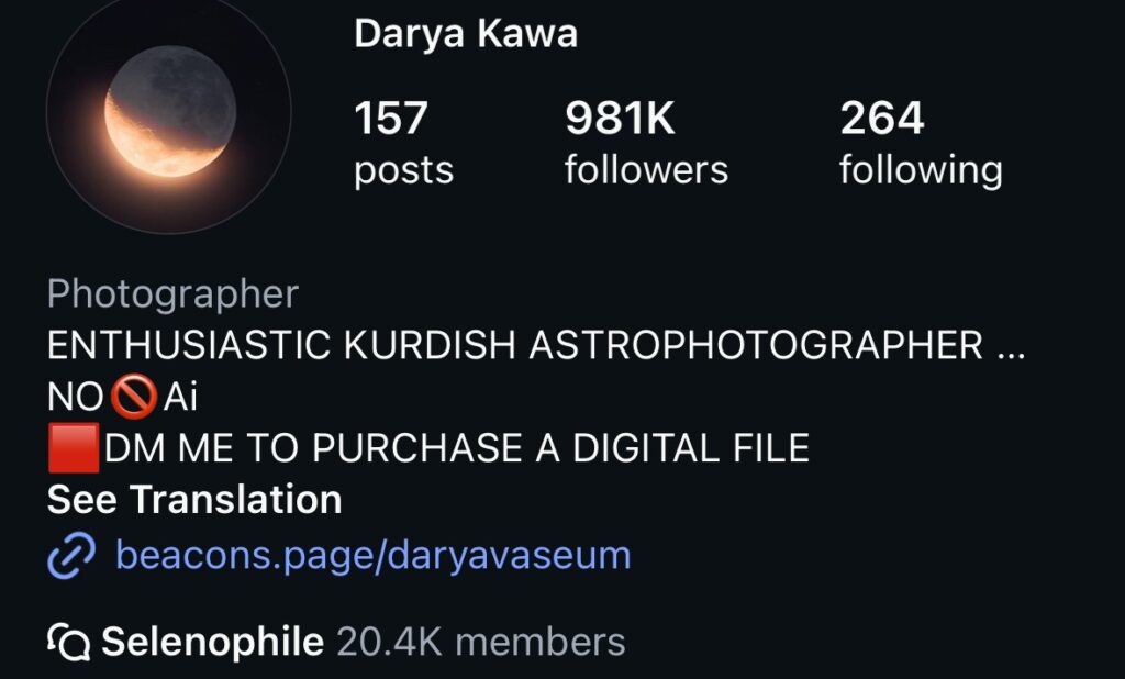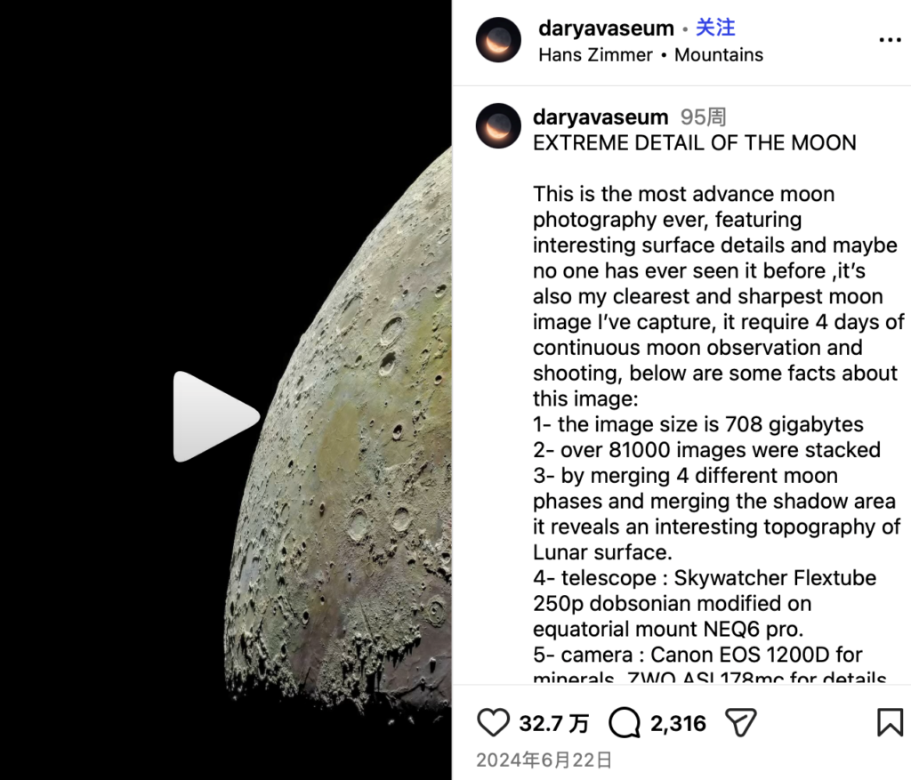 A reverse image search of several key frames reveals the video was first shared by user Darya Kawa (@daryavaseum) on Instagram almost two years prior, on June 22, 2024. In this original post, the user provided a detailed explanation of how the final video was produced using an advanced telescope and other high-tech tools.