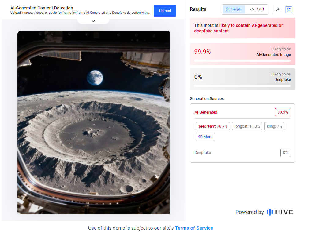 Beyond physical inconsistencies, the image was also uploaded to AI detection tools. “AI or Not” returned a 100% probability of AI generation, while HIVE’s tool returned a 99.9% likelihood.