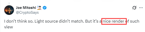 On April 8, 2026, following the image’s publication, user @cryptosays responded to a commenter, writing “nice render” — an acknowledgment that the image was AI-generated.