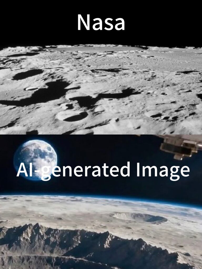 Blue Halo: The glowing blue halo along the lunar horizon in the image is physically impossible. Blue light scattering requires the presence of an atmosphere — which the Moon does not have. Authentic lunar photography shows a sharp, stark boundary between black space and the gray lunar surface, with no blue gradient.