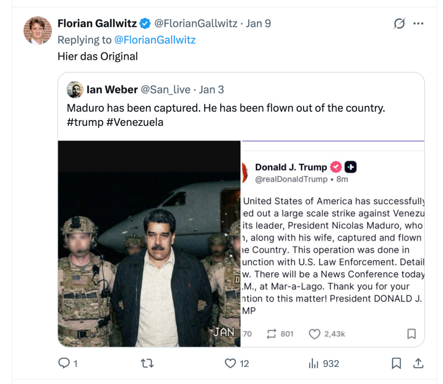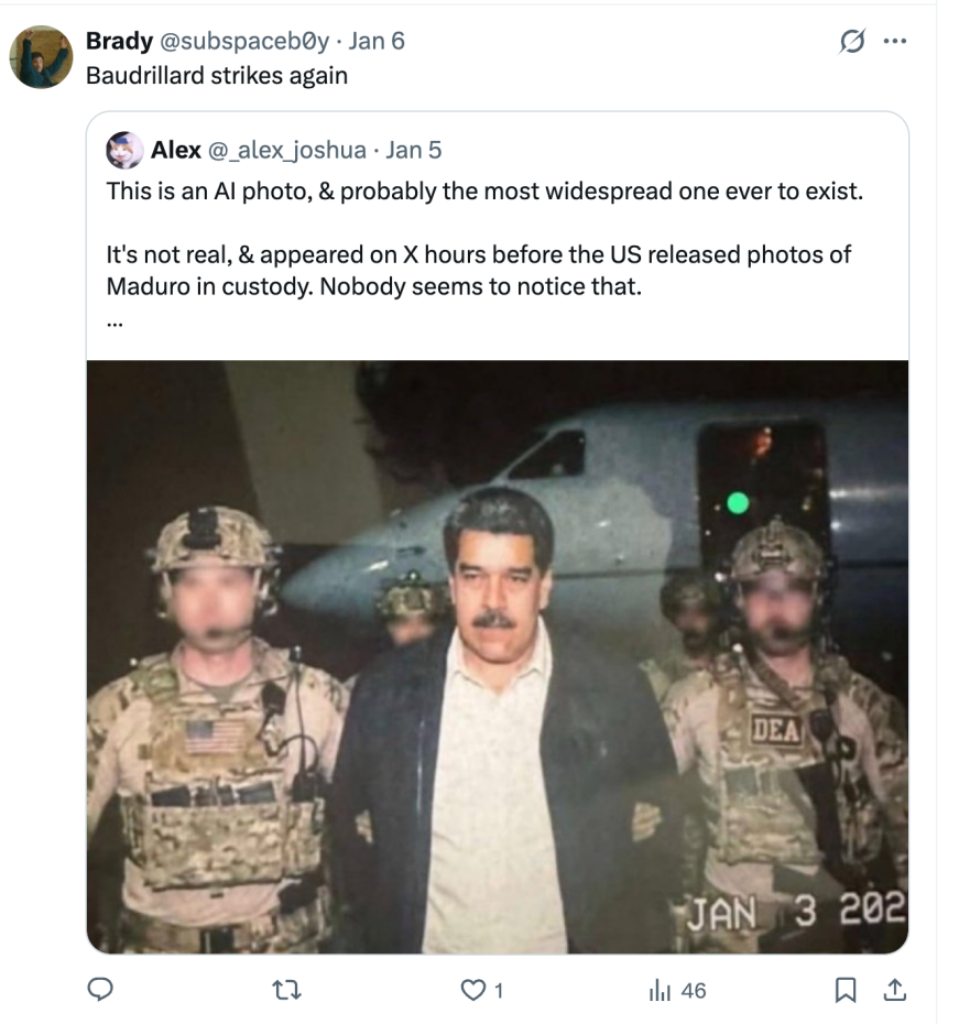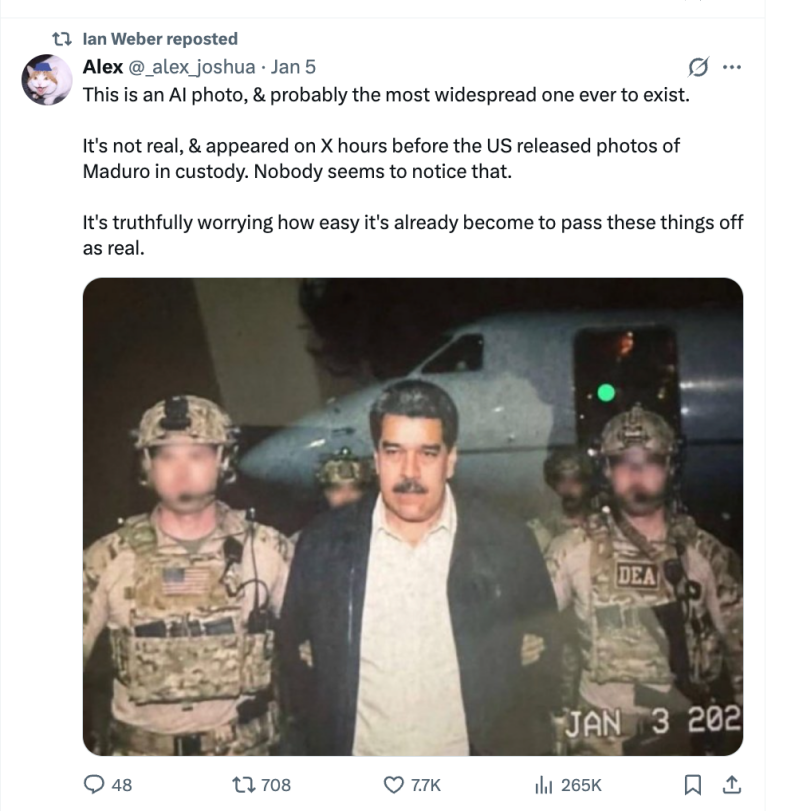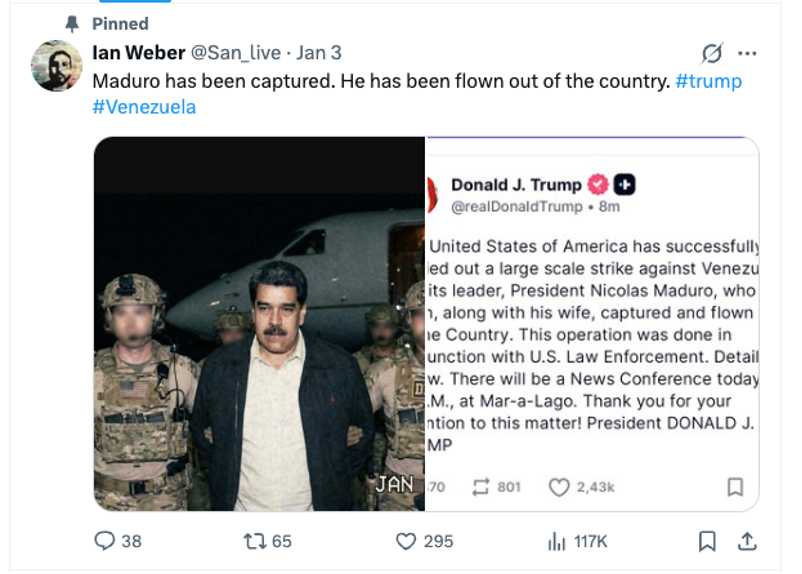 January 3: User @San_live on Platform X posted a fabricated image purporting to show the arrest of Venezuelan President Nicolás Maduro, shortly after unverified rumors about an arrest began circulating online.