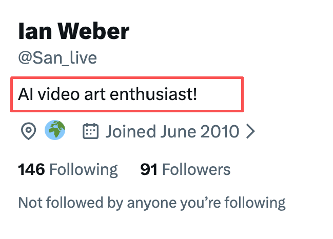 The account engages primarily with the AI creation community. Its content is highly focused on AI video generation tools, with about 95% of posts related to AI creation.