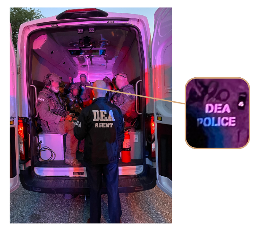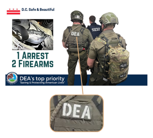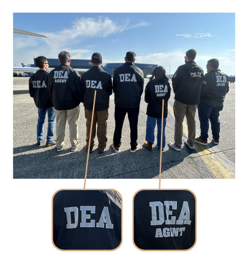 However, closer inspection raises questions about the insignia’s authenticity. “DEA” stands for the U.S. Drug Enforcement Administration. The mission of the DEA is to enforce U.S. controlled substance laws, bring drug trafficking organizations and their leaders to justice, and support programs that reduce the availability of illegal drugs domestically and internationally.