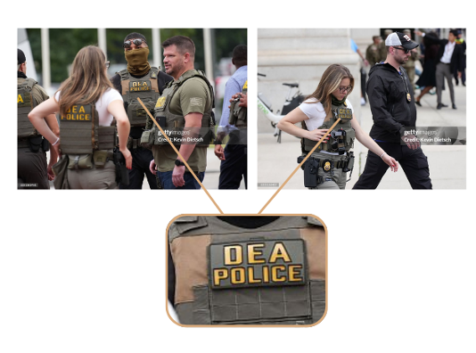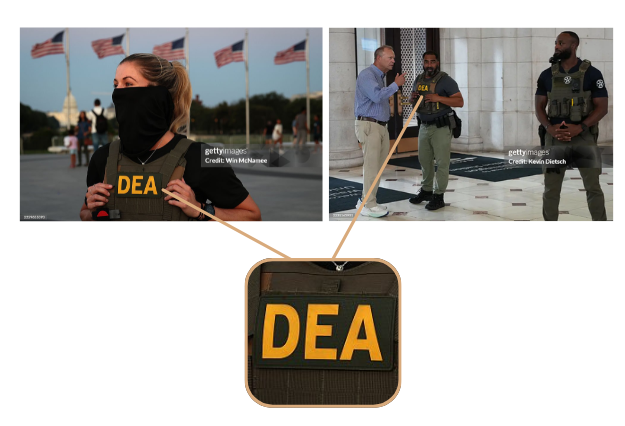 (1) Following a preliminary review, no direct evidence of image manipulation was identified. The image depicts two individuals presented as law enforcement officers, displaying different chest insignia: One wears a U.S. flag patch, while the other bears a label reading “DEA”.
