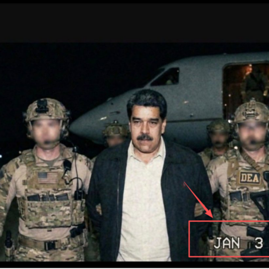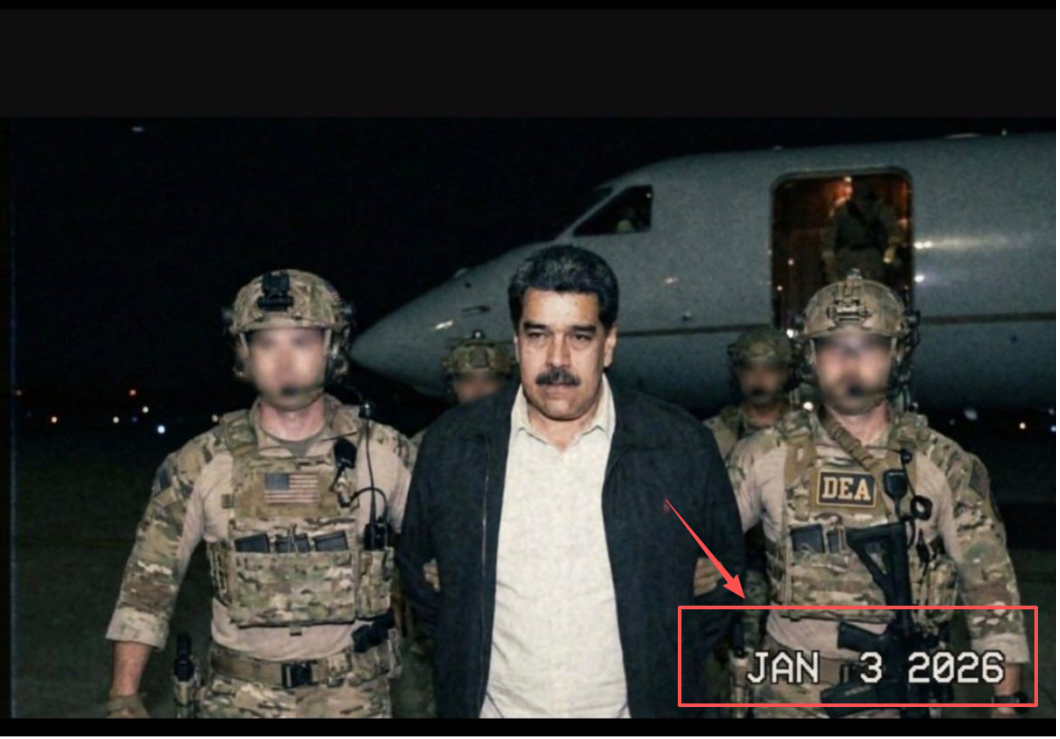 On January 3, 2026, after the United States launched a military operation against Venezuela and arrested President Nicolás Maduro and his wife, many related images circulated on social media. One widely shared image shows a man who closely resembles Maduro being escorted by American soldiers. Their clothing displays a U.S. flag and a “DEA” label. The image shows a “JAN 3 2026” watermark in the lower-right corner.