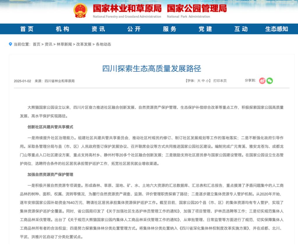 According to a report titled “Sichuan Explores Pathways for High-Quality Ecological Development” published on the official websites of the National Forestry and Grassland Administration and the National Park Administration, Sichuan has developed a community-level model of “co-construction, co-management, and benefit-sharing.” The model includes setting up ecological conservation posts, expanding income opportunities for local residents through ecological compensation and cultural tourism, and promoting legal awareness and environmental protection education.