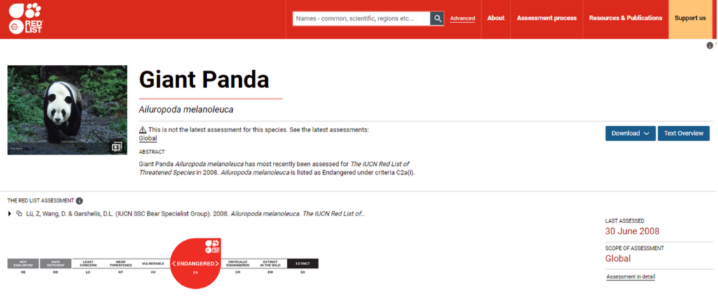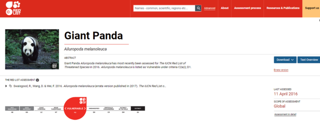According to data from the China Forestry Information Network, the First National Survey of Giant Pandas (1974–1977) recorded 2,459 wild individuals. The number declined to 1,114 during the Second National Survey (1985–1988), then increased to 1,596 in the Third National Survey (1999–2003), and further rose to 1,864 in the Fourth National Survey (2011–2014). These results indicate that conservation efforts have achieved clear progress. Furthermore, in 2016, the IUCN Red List officially downgraded the giant panda’s status from “Endangered” to “Vulnerable.”