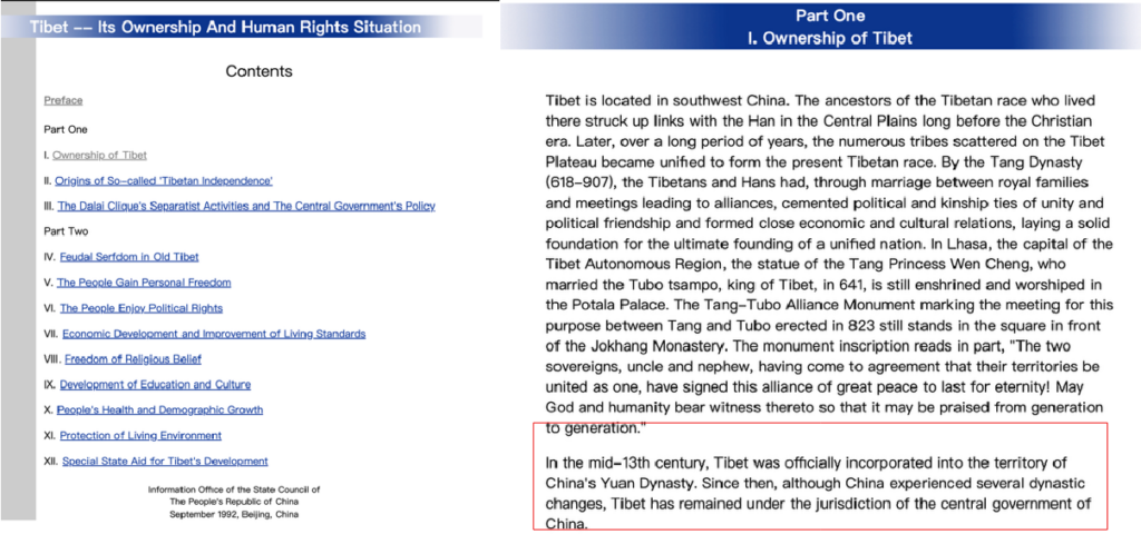 “In the mid-13th century, Tibet was officially incorporated into the territory of China’s Yuan Dynasty. Since then, although China experienced several dynastic changes, Tibet has remained under the jurisdiction of the central government of China.”