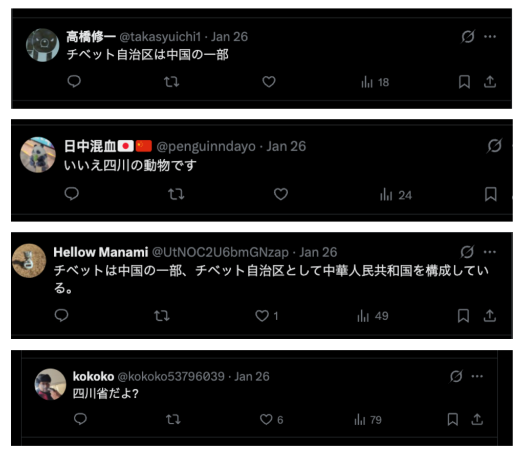 Based on an analysis of 500 user comments on X posted between January 25 and January 29, 2026, about 29 percent of comments focused on the origins and sovereignty of giant pandas. Some 7 percent challenged the original narrative, emphasizing that Xizang is part of China and that giant pandas primarily originate from Sichuan.