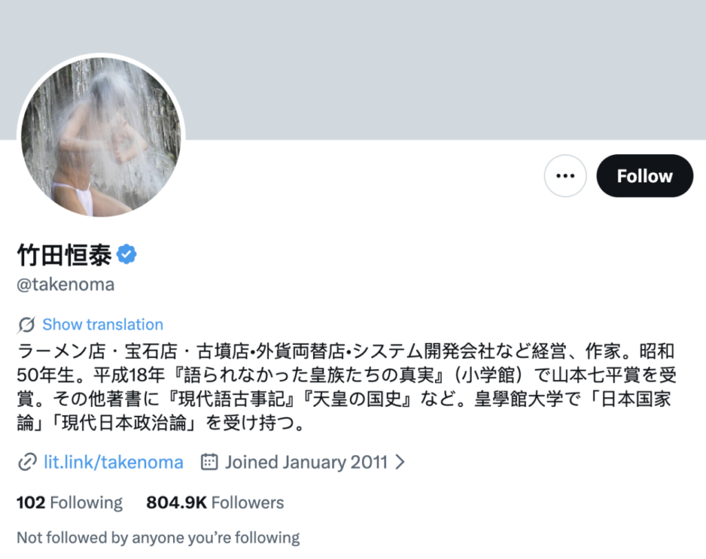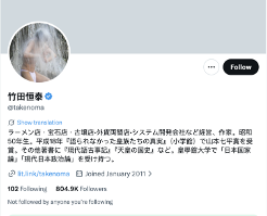 The profile for the account @takenoma identifies the user as an entrepreneur engaged in multiple business ventures, while also maintaining a public presence as an author. Born in 1975 (Showa 50), his representative work is The Untold Truth of the Imperial Family (Shogakukan).