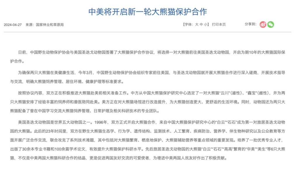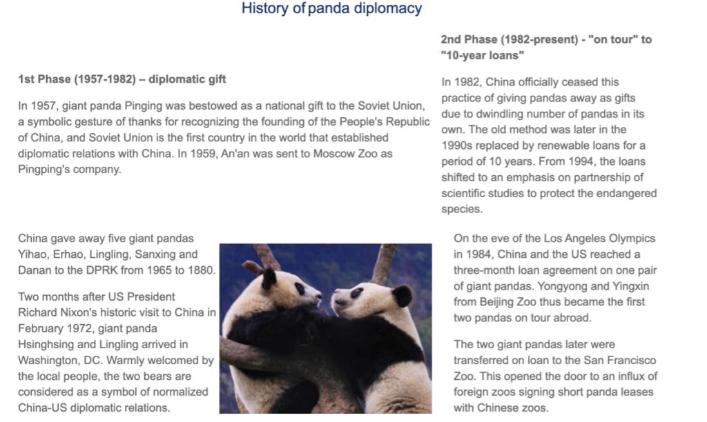 A review of official documents issued by the National Forestry and Grassland Administration and the National Park Administration, together with publications from the Chengdu Research Base of Giant Panda Breeding and reports from Chinese central state media, forms the basis for the following timeline of China’s diplomatic developments.