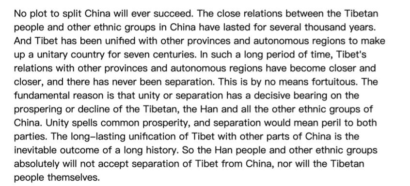 “The long-lasting unification of Tibet with other parts of China is the inevitable outcome of a long history. So the Han people and other ethnic groups absolutely will not accept separation of Tibet from China, nor will the Tibetan people themselves.”