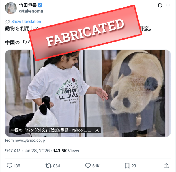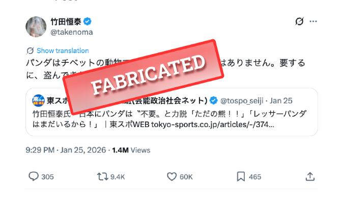 On January 28, 2026, Takeda issued a follow-up post on X, referencing the high-profile giant pandas once again and further associating the species with political topics.
