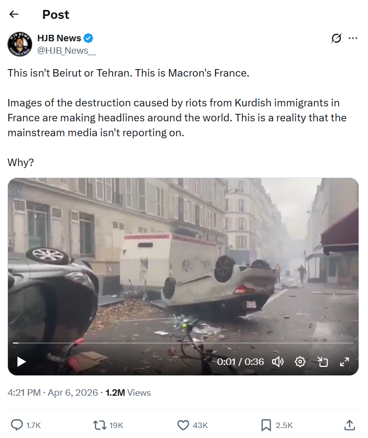 On April 6, 2026, X user @HJB_News__ posted a video purporting to show scenes of destruction on the streets of France, including burning and vandalized vehicles and buildings. The accompanying caption read: “This isn’t Beirut or Tehran. This is Macron’s France. Images of the destruction caused by riots from Kurdish immigrants in France are making headlines around the world. This is a reality that the mainstream media isn’t reporting on. Why?” The post received over 1.2 million views and more than 63,000 interactions.