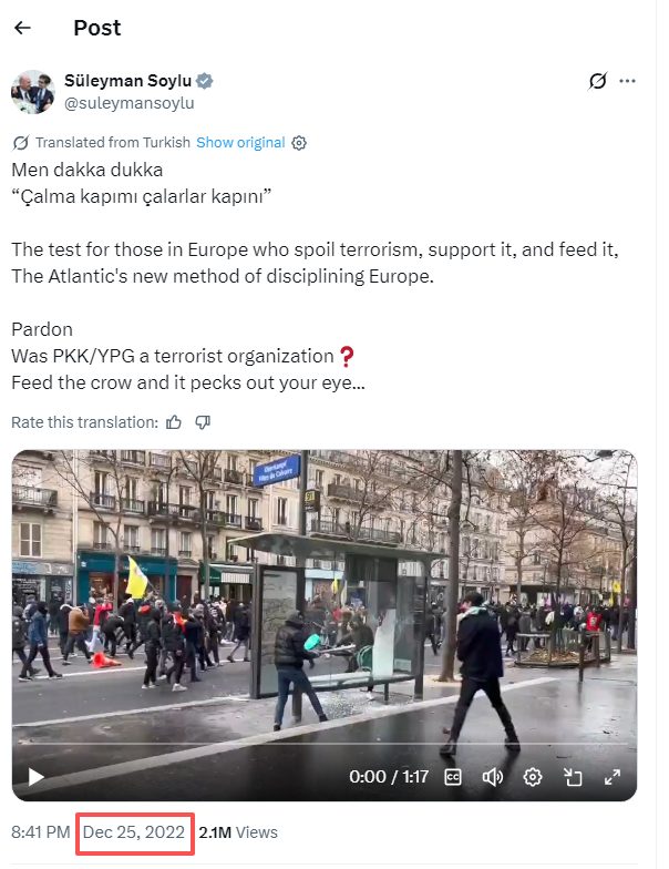 A reverse image search of keyframes shows that the footage posted by @HJB_News__ closely matches, both in terms of visual elements and camera angles, videos posted by @RemyBuisine (December 24, 2022) and by then-Turkish Interior Minister Süleyman Soylu (@suleymansoylu, December 25, 2022).