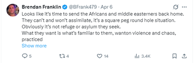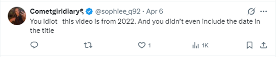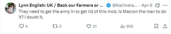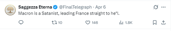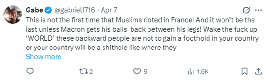 The post received over 1,700 replies. Comments related to immigration and multiculturalism constituted the largest proportion, followed by comments mentioning French President Emmanuel Macron and the French government. However, compared to the large volume of other comments, there were relatively few which questioned the video’s authenticity or engaged in any attempt to fact-check or verify the scenes shown.