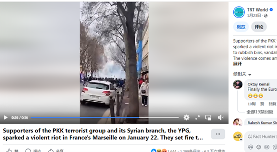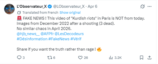 Cross-verification confirms that the video posted by @HJB_News__, which claims to show “riots caused by Kurdish immigrants currently taking place in ‘Macron’s France’ in 2026,” is historical footage dating back to December 2022. The French government’s counter-disinformation agency, French Response, also confirmed this fact. This case is a typical example of “old video, new context” disinformation which has spread across multiple platforms. Users are advised to remain cautious when encountering dramatic or violent footage on social media, to verify events through multiple sources, and to prioritize information released by official authorities.