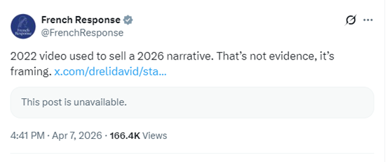 On April 7, 2026, “French Response,” the official counter-disinformation X account of the French Ministry for Europe and Foreign Affairs, confirmed that the circulating video was filmed back in 2022. Responding to a now-deleted post, the agency characterized the video’s spread on social media as “framing” rather than “evidence.”