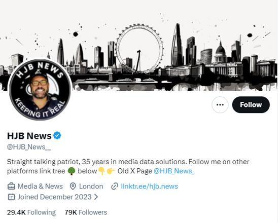 The X user @HJB_News__ registered their account in December 2023. Their account bio describes the user as a “Straight talking patriot, 35 years in media data solutions. Follow me on other platforms link tree,” and directs followers to a previous account (@HJB_News_), which currently has 4,460 followers and whose bio points to the new account. The account under review has 79,000 followers and holds a blue checkmark (verified) certification.