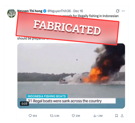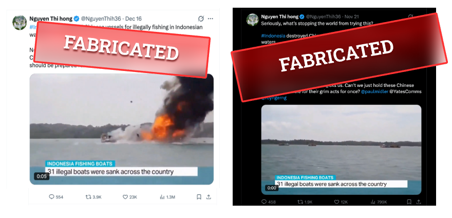 On December 16, the X account @Nguyen Thi hong posted a video alleging that “Indonesia destroyed Chinese vessels for illegally fishing in Indonesian waters,” which has received more than 1.3 million views and 25,000 engagements.