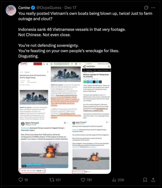 However, the authenticity of the video was quickly questioned. The following day, on December 17, another X user, @Corrine, pointed out a key discrepancy: the footage actually depicts Vietnamese fishing vessels being sunk by the Indonesian authorities,not Chinese ones. @Corrine concluded that the video’s content does not match the post’s description.