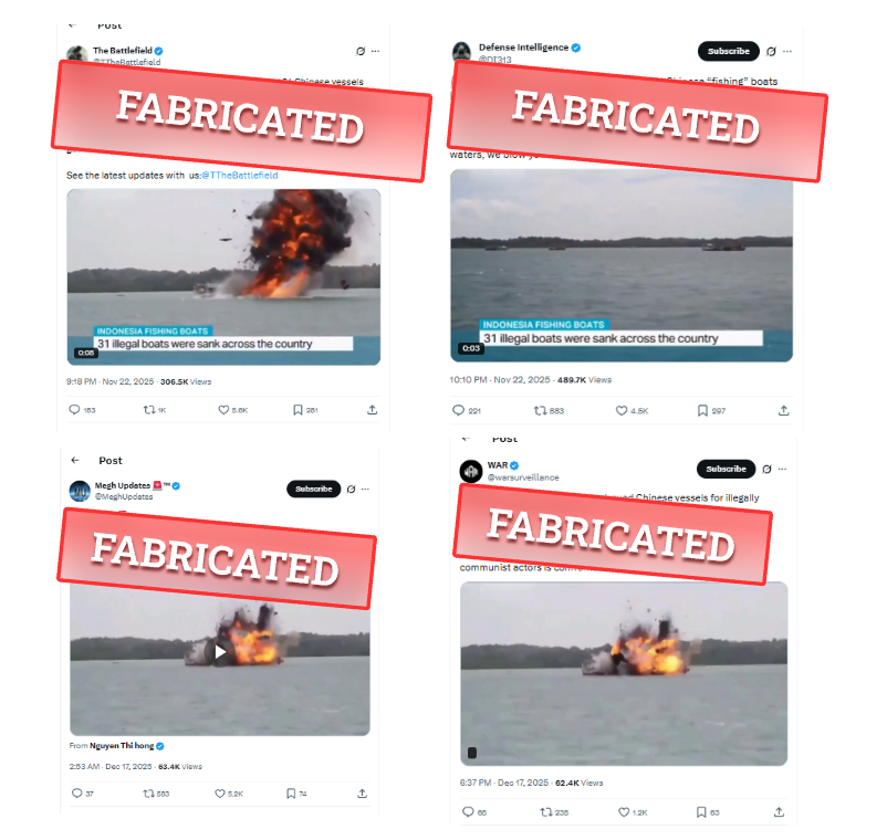 On December 16, 2025, the X account @Nguyen Thi hong posted a video on the platform. The on-screen text reads “INDONESIA FISHING BOATS:31 illegal boats were sunk across the country.” The footage shows several boats being destroyed in explosions. The post claims, “#Indonesia destroyed Chinese vessels for illegally fishing in Indonesian waters. Now, China must realize that ‘OUR actions will be the consequence of CHINA’s actions.’ If China dares to harass our people in our waters, it should be prepared for similar treatment.” The post has garnered over 1.3 million views and over 25,000 interactions. However, the same account had already posted the same video on November 21.